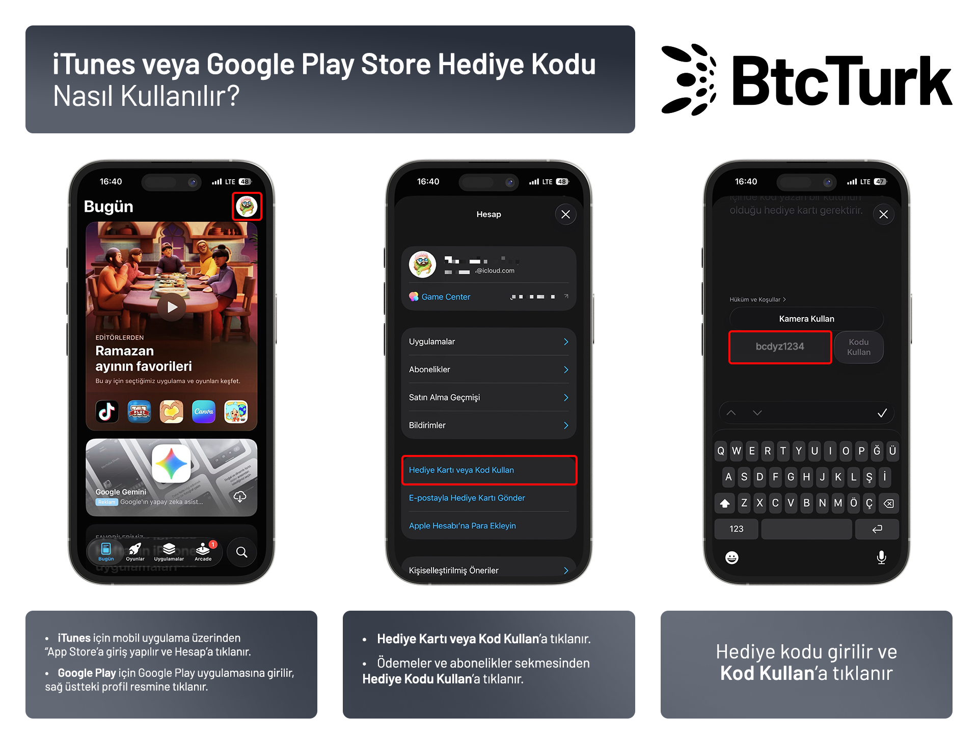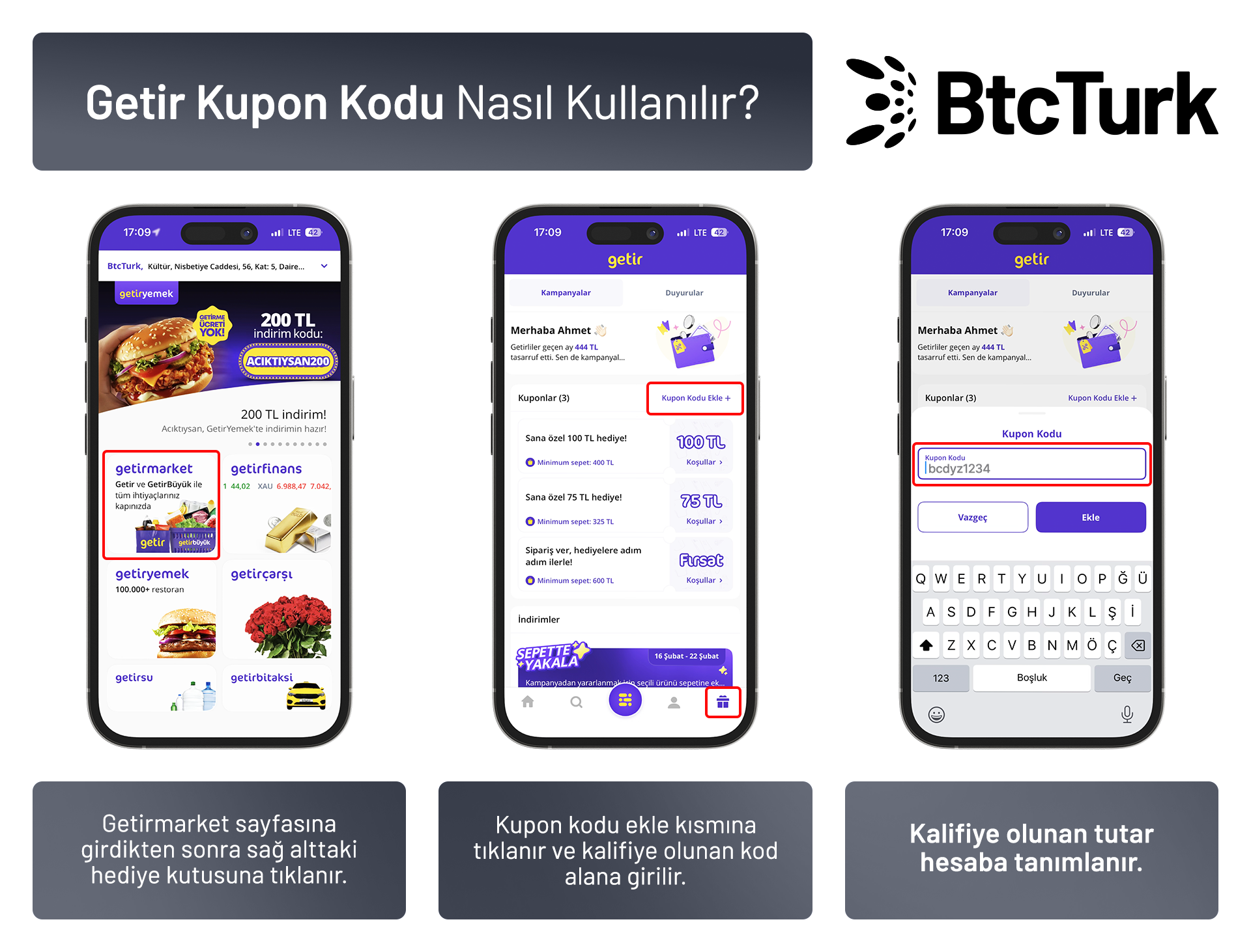 Kullanıcıların yeni üye olduktan 30 gün sonunda aşağıda belirtilen ulaşacakları hacimler kadar hediye çeki (“Ödül”) kazanacaktır. Ödül kazanan kullanıcılara mail aracılığıyla bildirimi yapılacaktır. Kullanıcıların mail bildirimine istinaden hediye çeklerini alabilmeleri için https://ayricaliklar.btcturk.com/ sitesine girmeleri ve form doldurmaları gerekmektedir. Kullanıcılar form doldururken kazandığı hediye çekleri arasından diledikleri marka ile hak ettikleri tutarı seçerek, hediye çekini kod olarak alabileceklerdir. Hediye çeklerine ilişkin detay bilgi ilgili web sitesinde yer almaktadır.